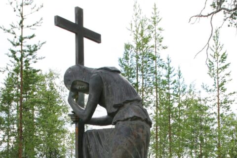 Die Statue vor der Kapelle ist für die Ehre der weißmeerkarelischen Sängerinnen der Klagelieder errichtet worden. Die Bildhauerin heißt Nina Sailo.