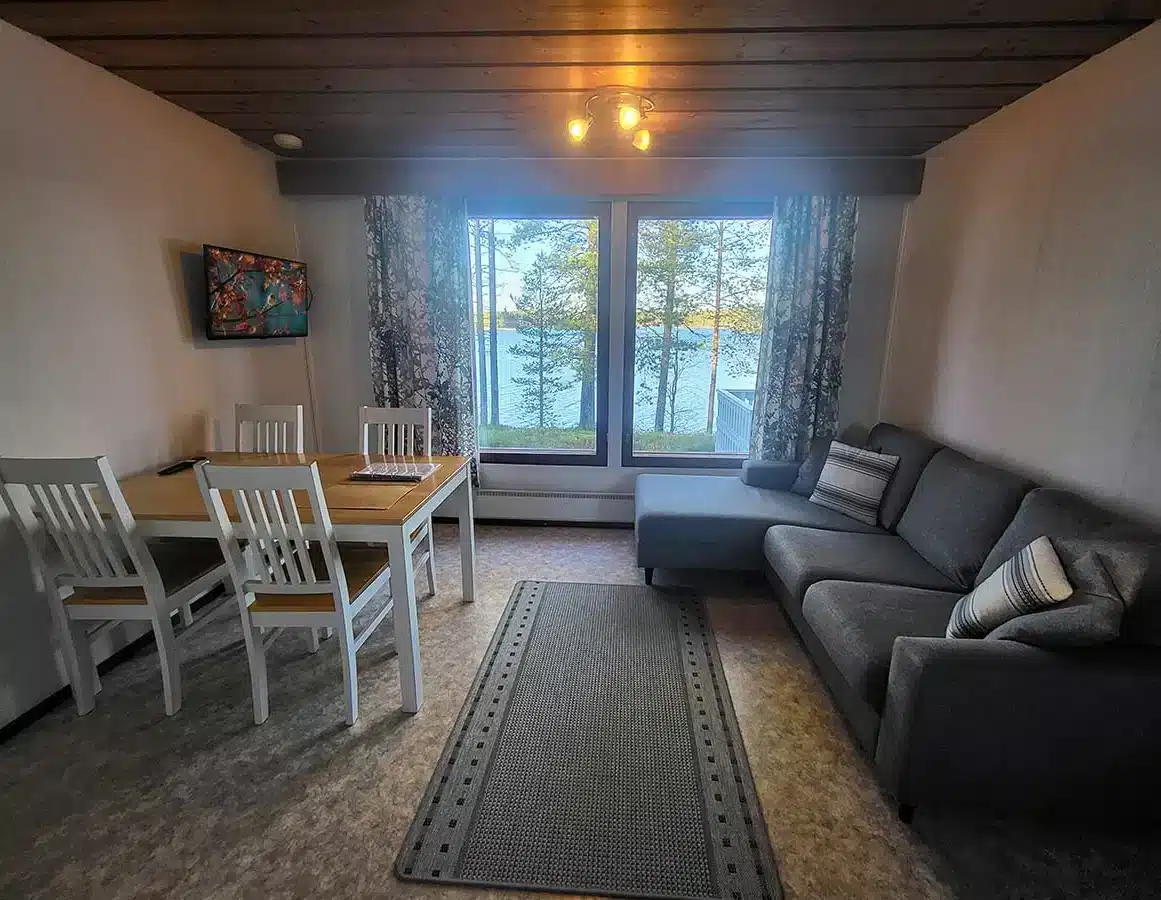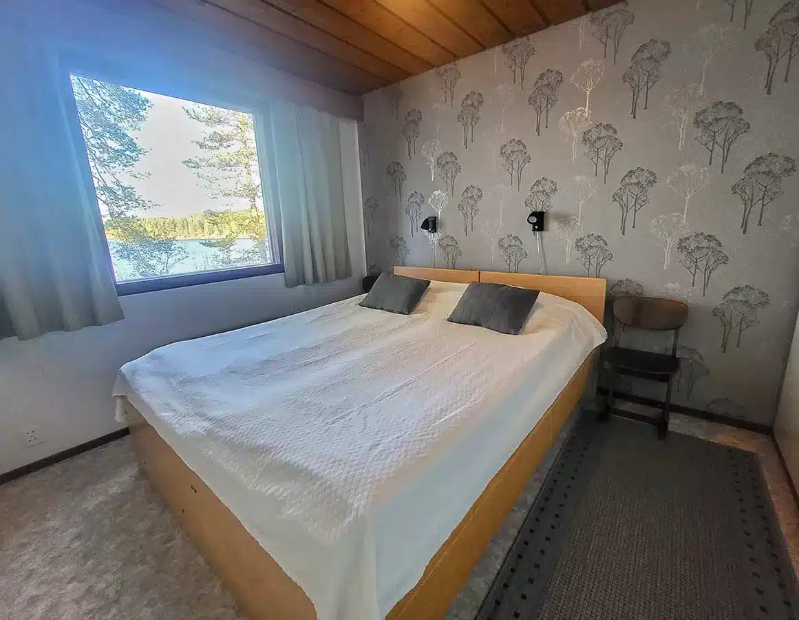 The living area has big windows to take in the beautiful lake views! The double bed can be separated in to two single beds, so this cottage is very suitable for groups of friends as well as families. It has a well equipped kitchen, toilet, shower and sauna. Available all-year-round. Pets allowed for an extra charge of 10€ (number of pets does not affect the price).