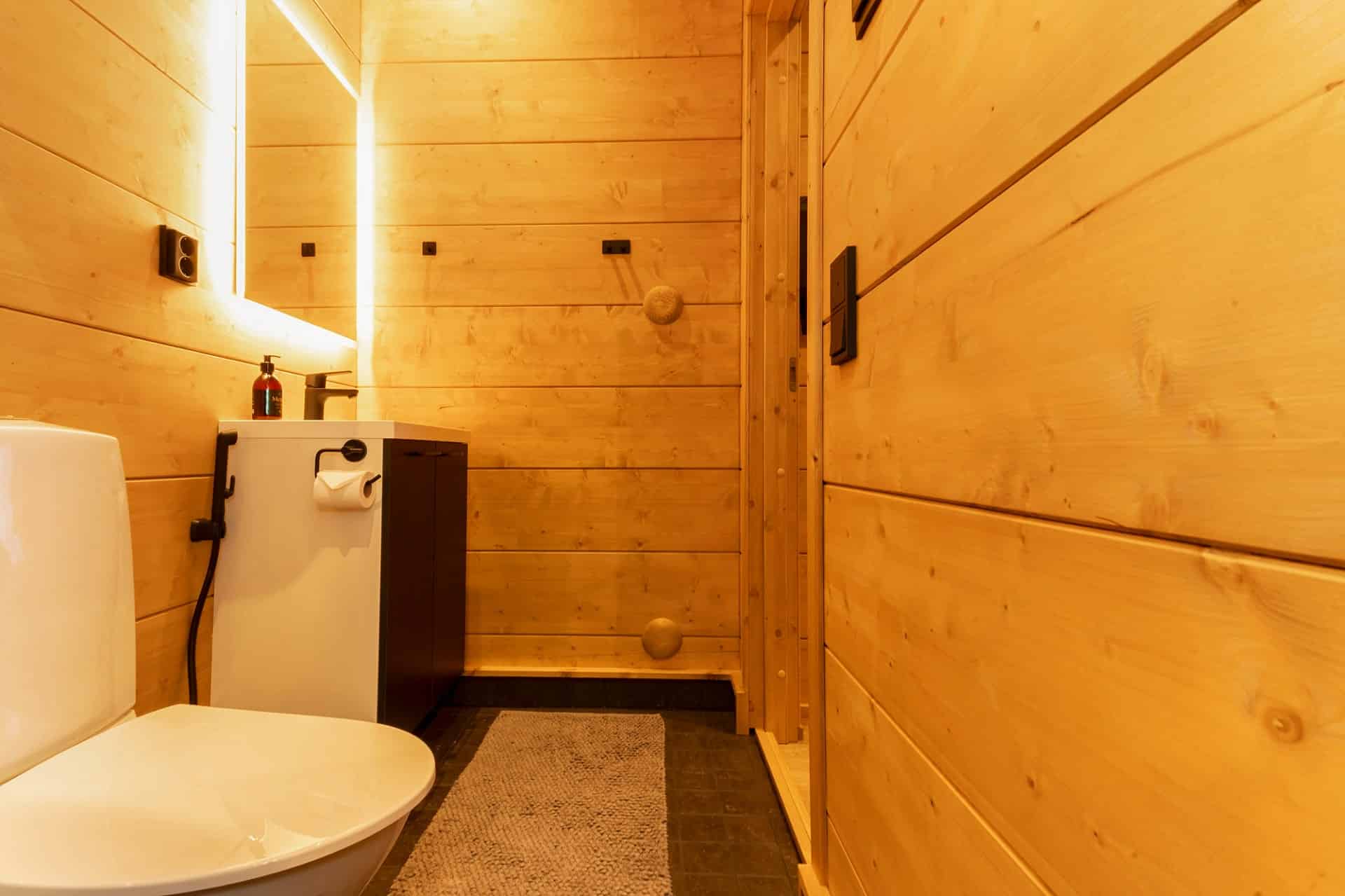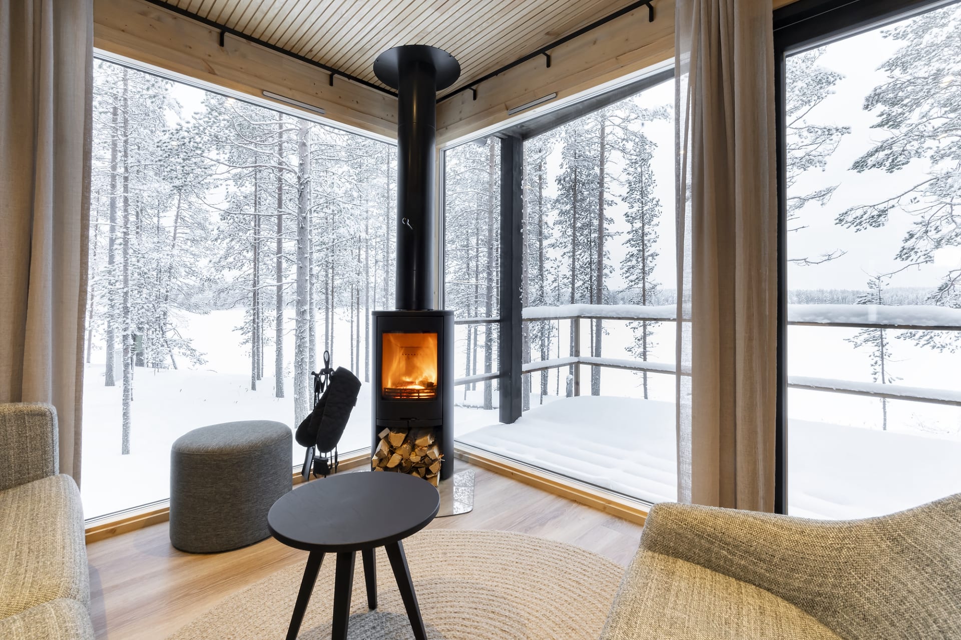 This chalet is the perfect place to unwind and enjoy the peace of nature. Floor-to-ceiling windows and a lake-facing terrace bring the beauty of the surroundings right into the cabin. Glowing sunsets in summer and northern lights in winter create unforgettable moments.