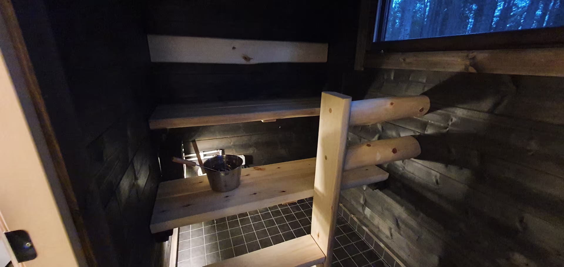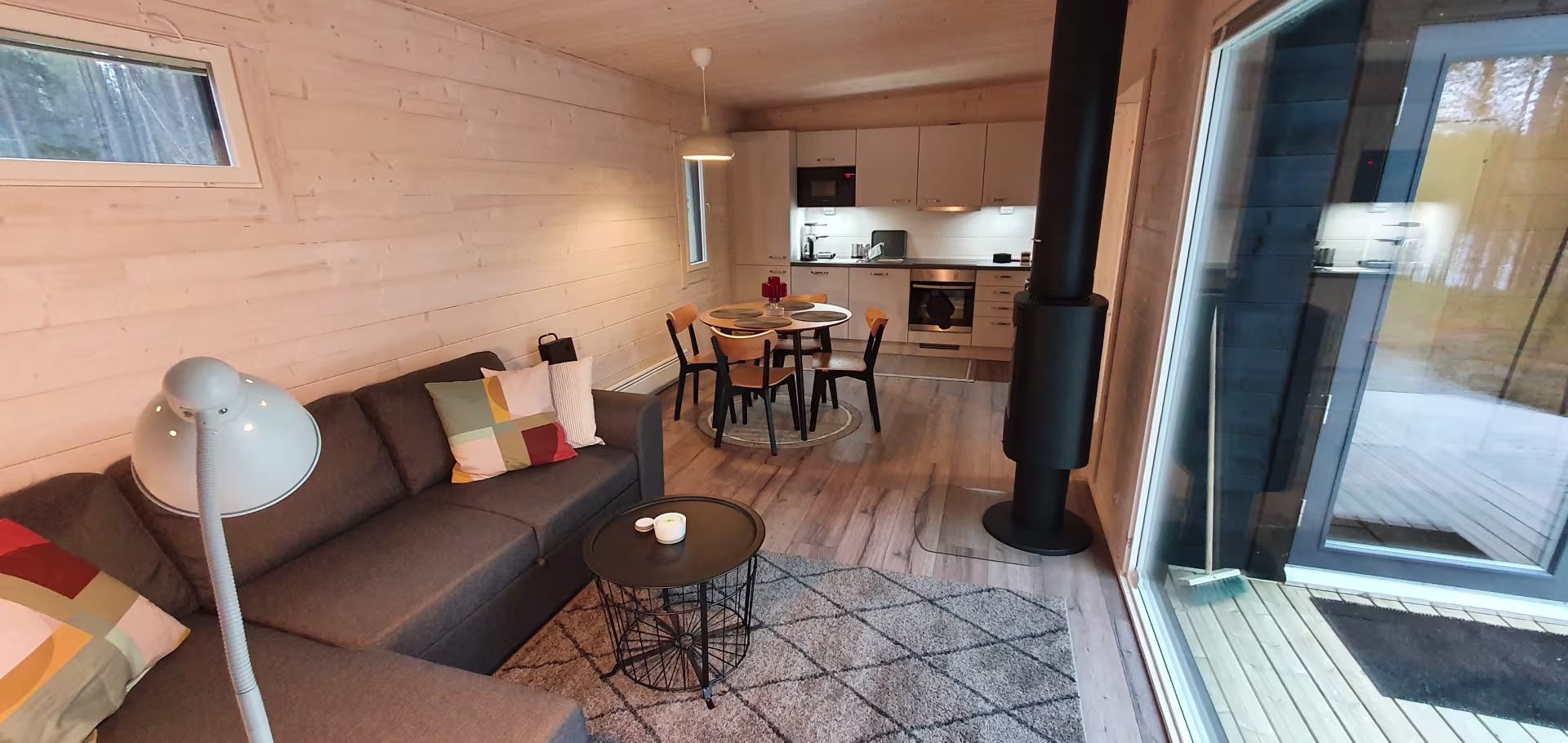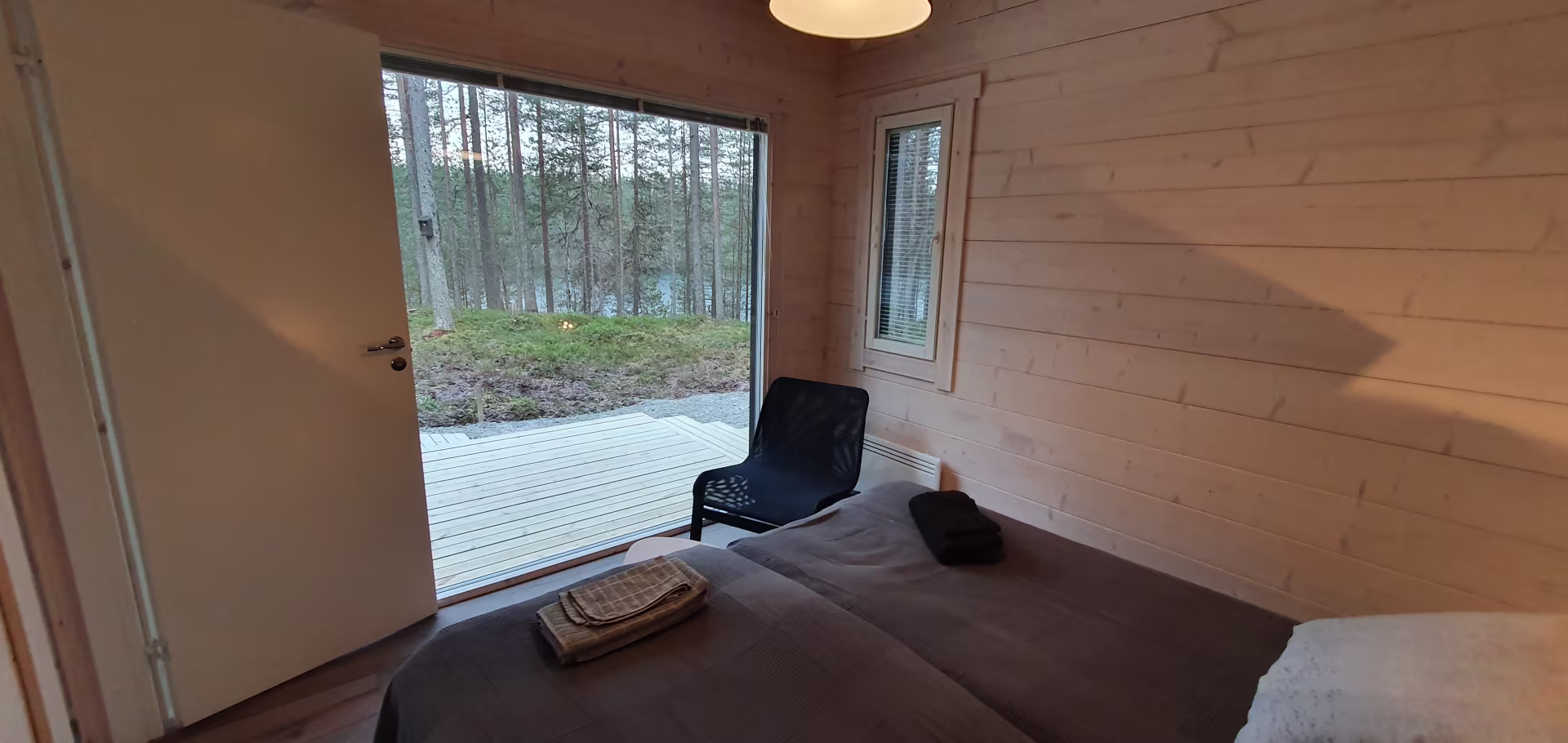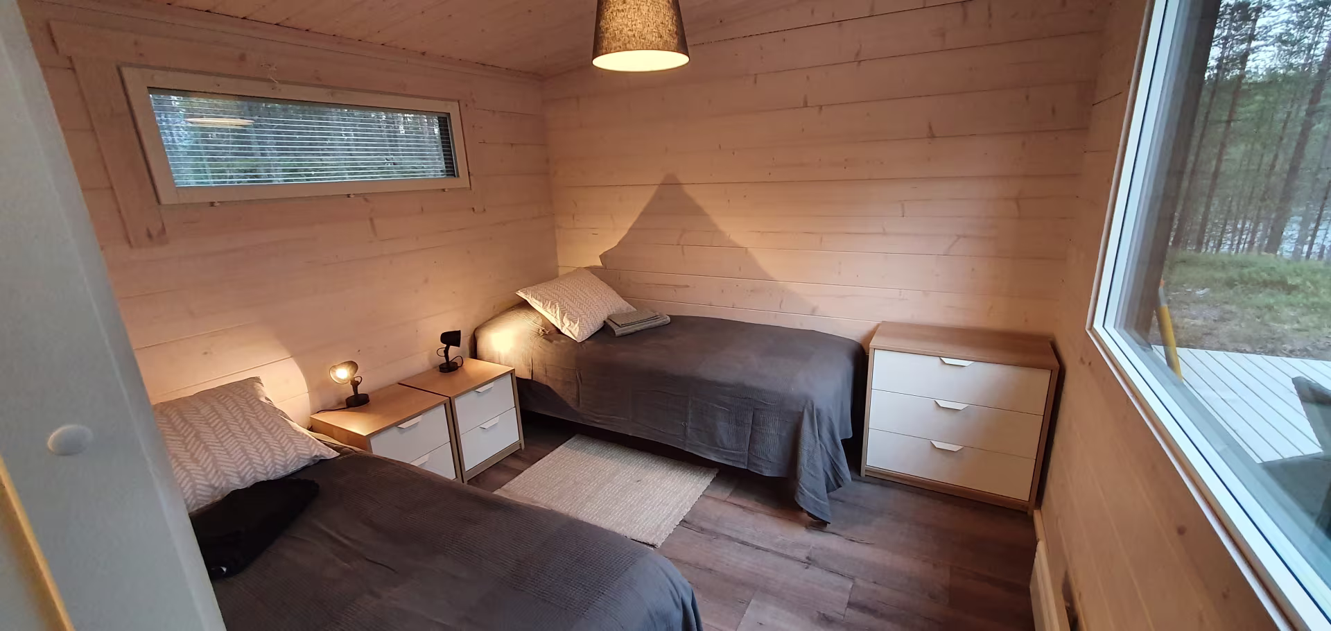 The cabin is equipped with electricity, a toilet, a shower, and an electric sauna. It features a combined living room and kitchen, as well as two bedrooms. Large windows in both the cabin and the sauna offer beautiful views of Lake Öllörijärvi. A private beach and a boat are also available for use.