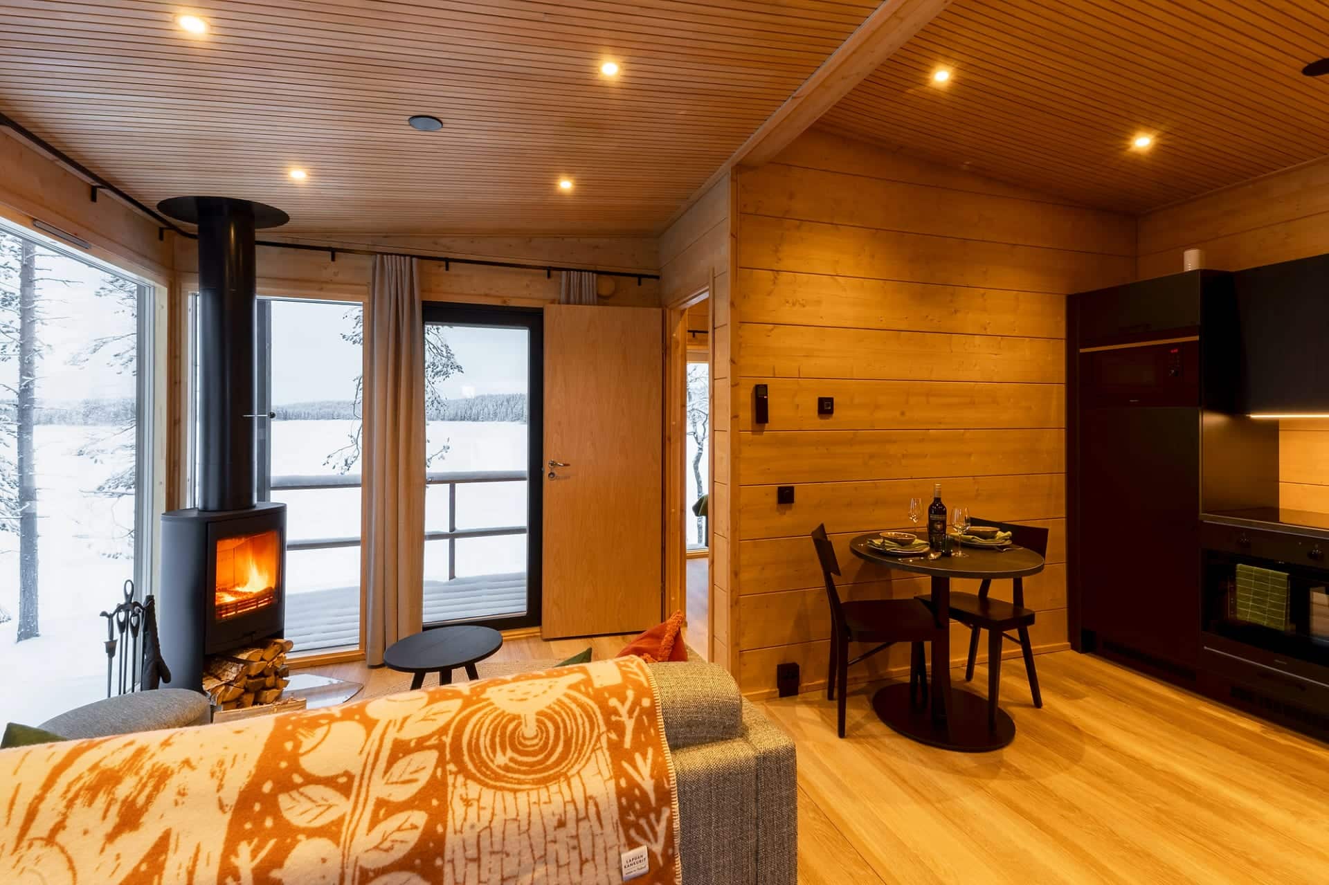 Huvila tarjoaa täydellisen ympäristön rentoutumiseen luonnon rauhassa. Suuret ikkunat ja järven puoleinen terassi tuovat kauniin maiseman osaksi mökkielämää. Kesällä ilta-auringon sävyt ja talvella revontulten loimu tekevät hetkistä ikimuistoisia.