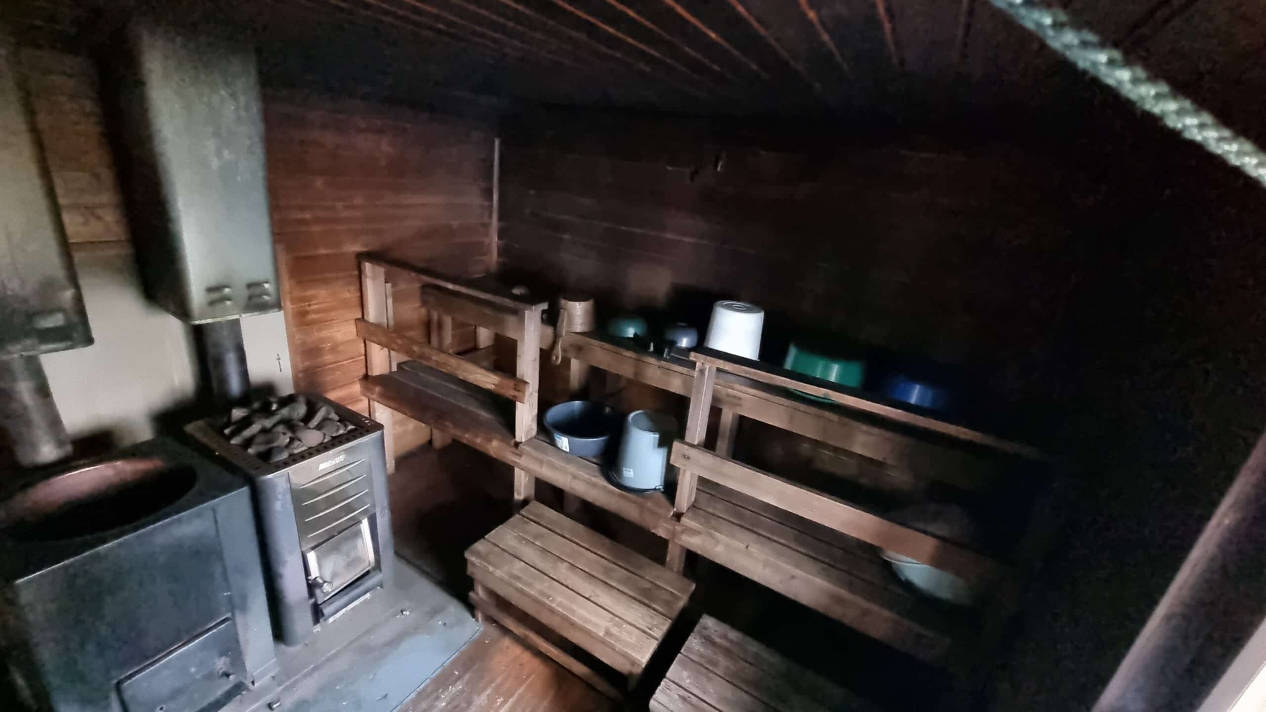 Paasonkosken eräkämpän saunan lauteet sankkoineen kuvattuna sisältä.