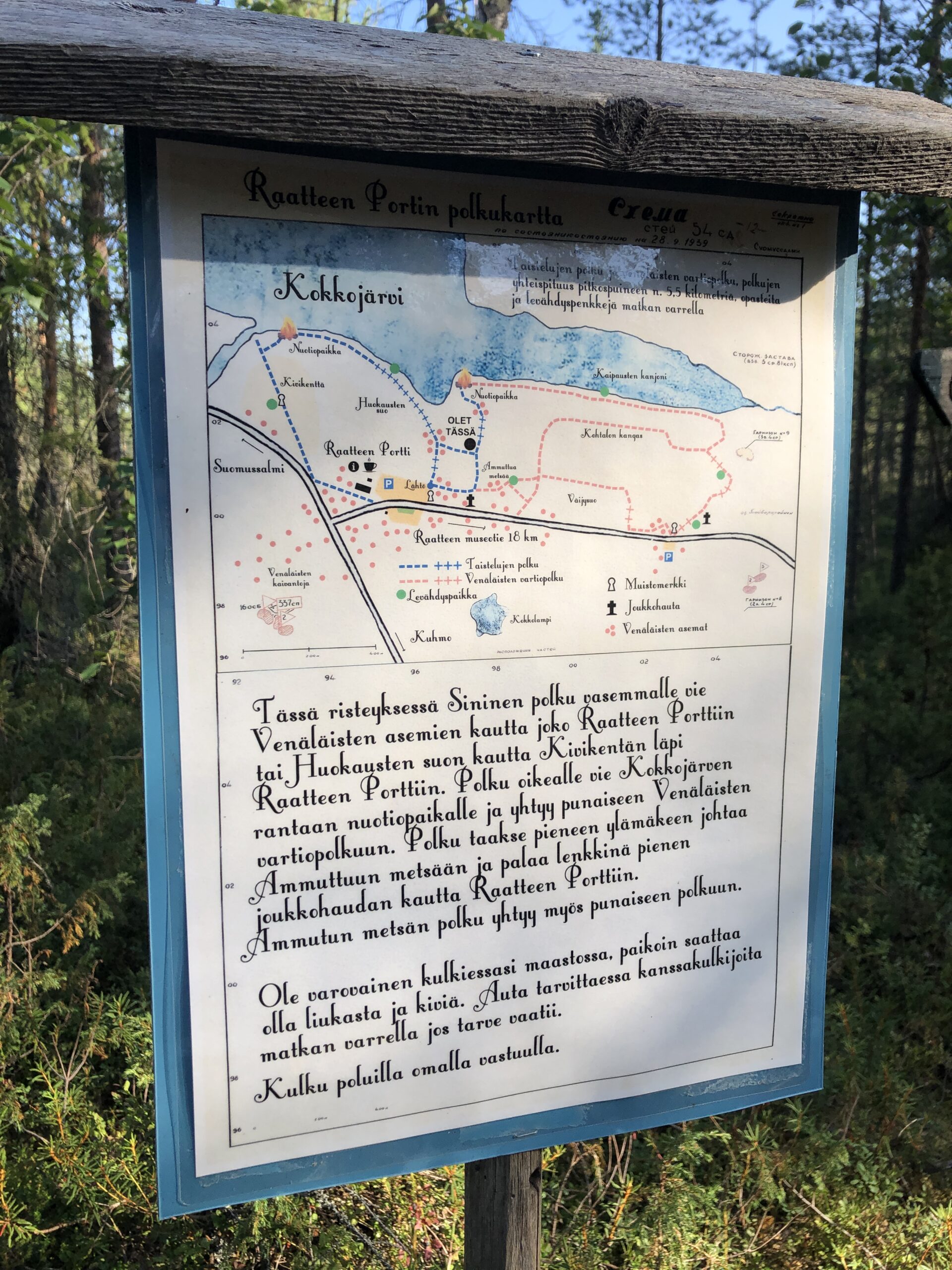 Alueella on myös entisöityjä suomalaisten ja neuvostoliittolaisten sotilaiden majoitteita, talvisodan aikaisia asumiskuoppia, vainajien hautoja ja jopa räjähtämättömiä ammuksia. Muistathan, että kaivaminen on ilman maanomistajan lupaa ehdottomasti kiellettyä.