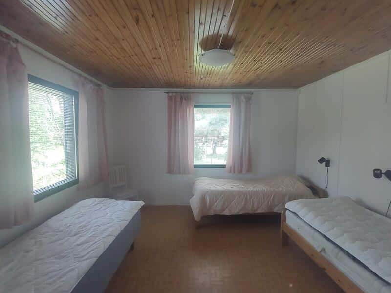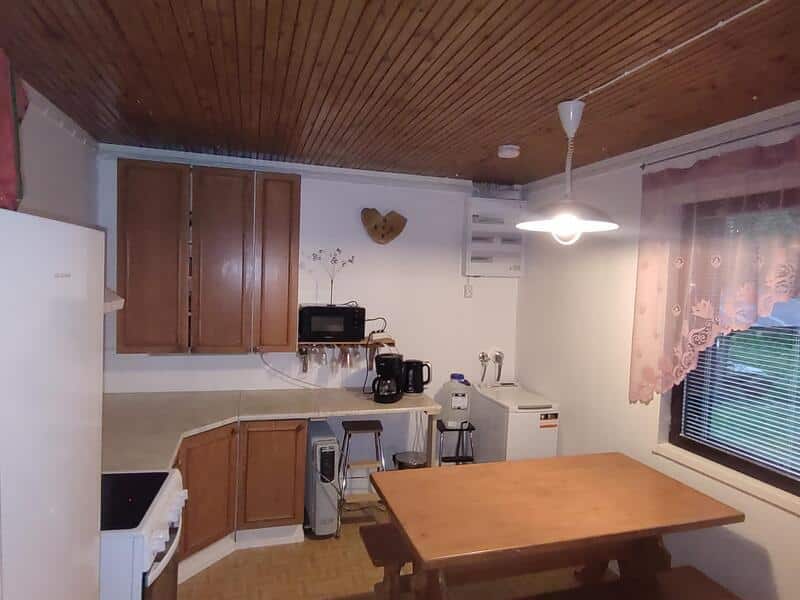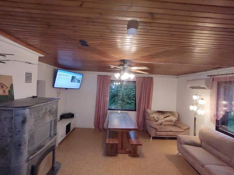 Karhunpesän maalaistalosta löytyy tilava olohuone, jonka pitkä pirtinpöytä sopii suuremmankin perheen ruokailuun. Varaava takka tuo lämpöä ja tunnelmaa, ja ilmalämpöpumppu säätää mökin lämpötilan miellyttäväksi ympäri vuoden. Hyvin varustellussa keittiössä on kaksi jääkaappipakastinta ja vuonna 2024 uusitut kodinkoneet. Karhunpesässä on kolme makuuhuonetta, joista kaksi on yläkerrassa ja yhteensä vuodepaikkoja löytyy seitsemälle hengelle. Lisäksi käytössäsi on sisäsauna sähkökiukaalla sekä suihku ja WC-tilat.